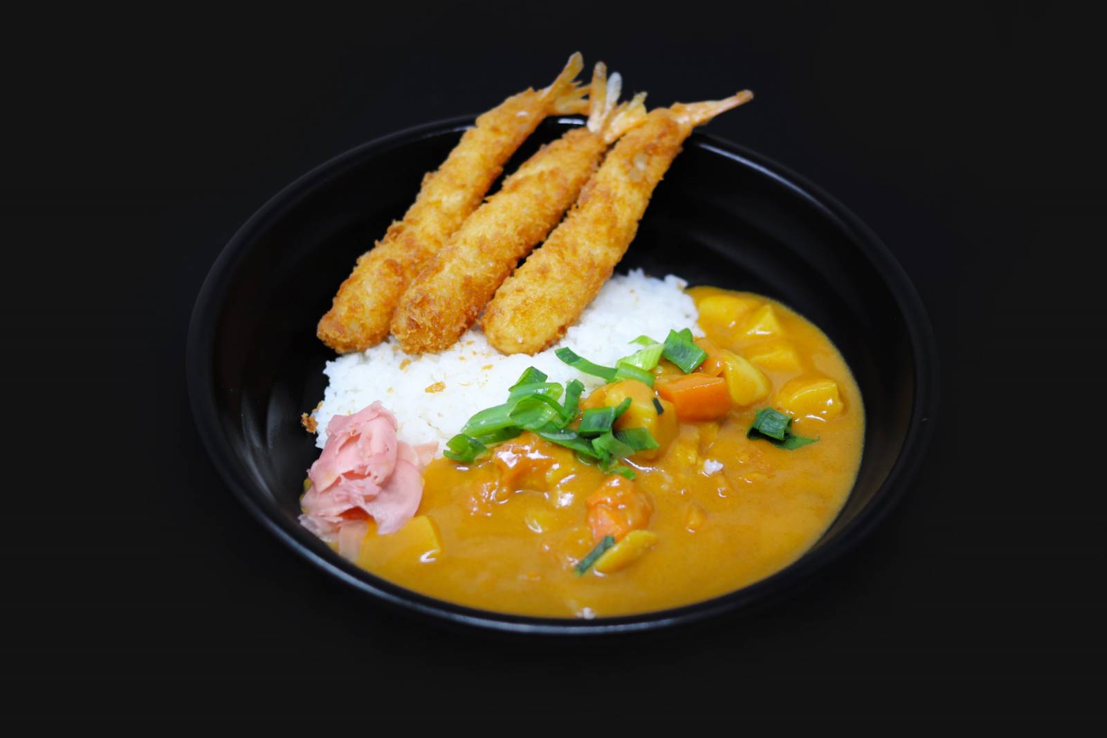 ebi fry, crevettes panées, curry rice, bol de riz composé de sauce curry, protéine et légumes